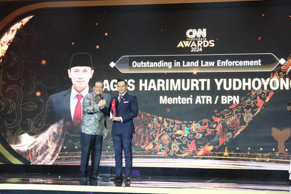 Surabaya – Menteri Agraria dan Tata Ruang/Kepala Badan Pertanahan Nasional (ATR/BPN), Agus Harimurti Yudhoyono (AHY) menerima penghargaan atas sinergi dan kolaborasi yang dilakukan dalam pemberantasan mafia tanah bersama kepolisian, kejaksaan, dan pemerintah daerah. Penghargaan _Outstanding in Land Law Enforcement_ ia terima dalam CNN Indonesia Awards 2024, Rabu (25/09/2024).